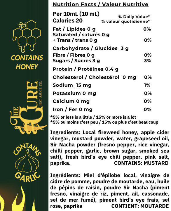 This one will make you sweat under the eyes just a little! Using local fireweed honey from Frederick’s Honey for bright notes, this mustard leads with sweetness and then the fire begins to grow. To reduce food waste, we upcycle a dehydrated hot sauce mash from our friends at The Cure Hot Sauce Company, add fresh bird’s eye chilis, and the result is a wily little rooster who is perfect for marinades!!!